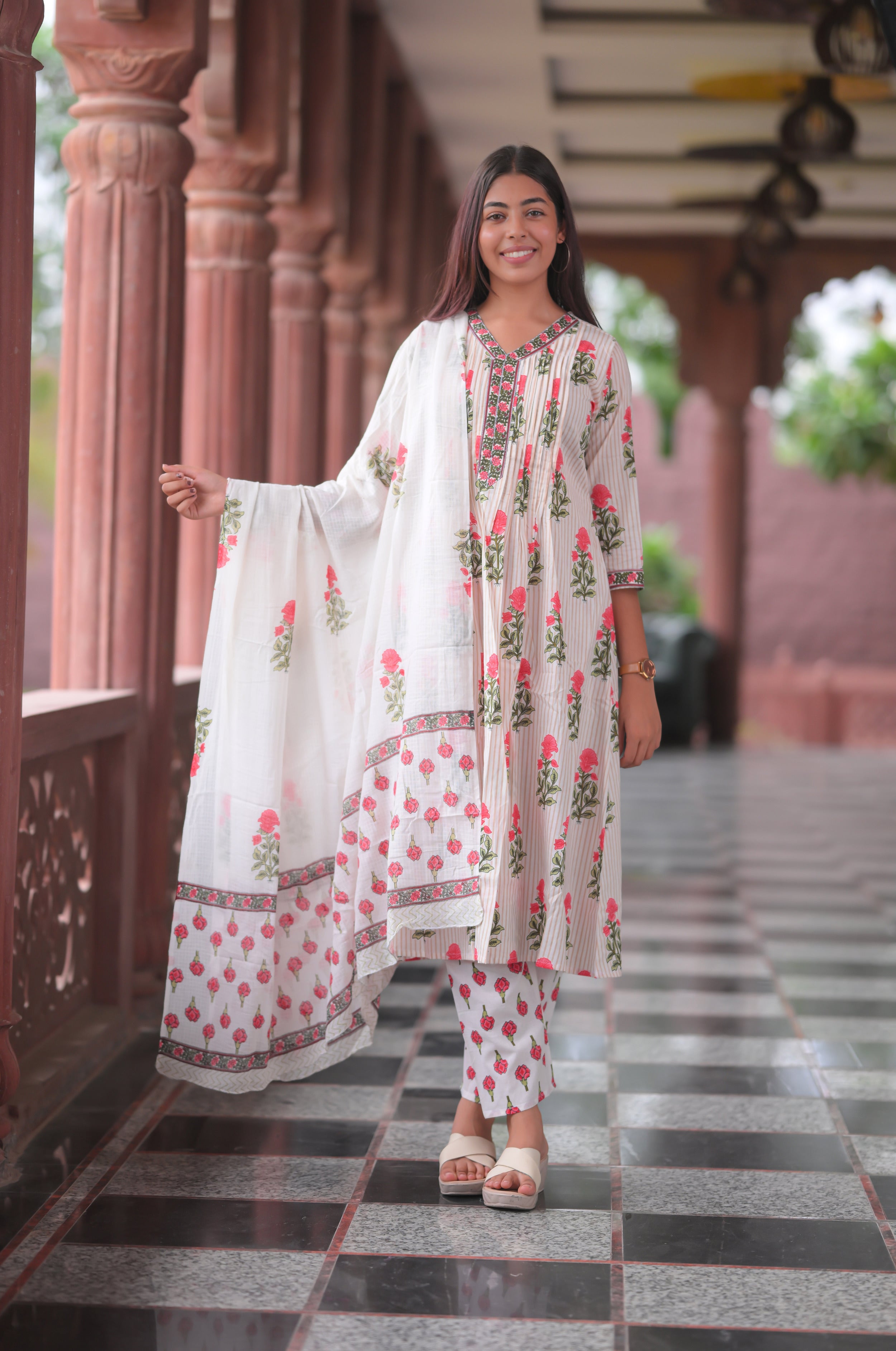 This 3-piece ensemble features a straight kurta with delicate vertical stripes overlaid by beautiful blush pink floral block prints, exuding traditional elegance. It is paired with floral-printed cotton tapered pants and a lightweight white voile dupatta, adorned with matching border and motifs that enhance the grace of the overall outfit.