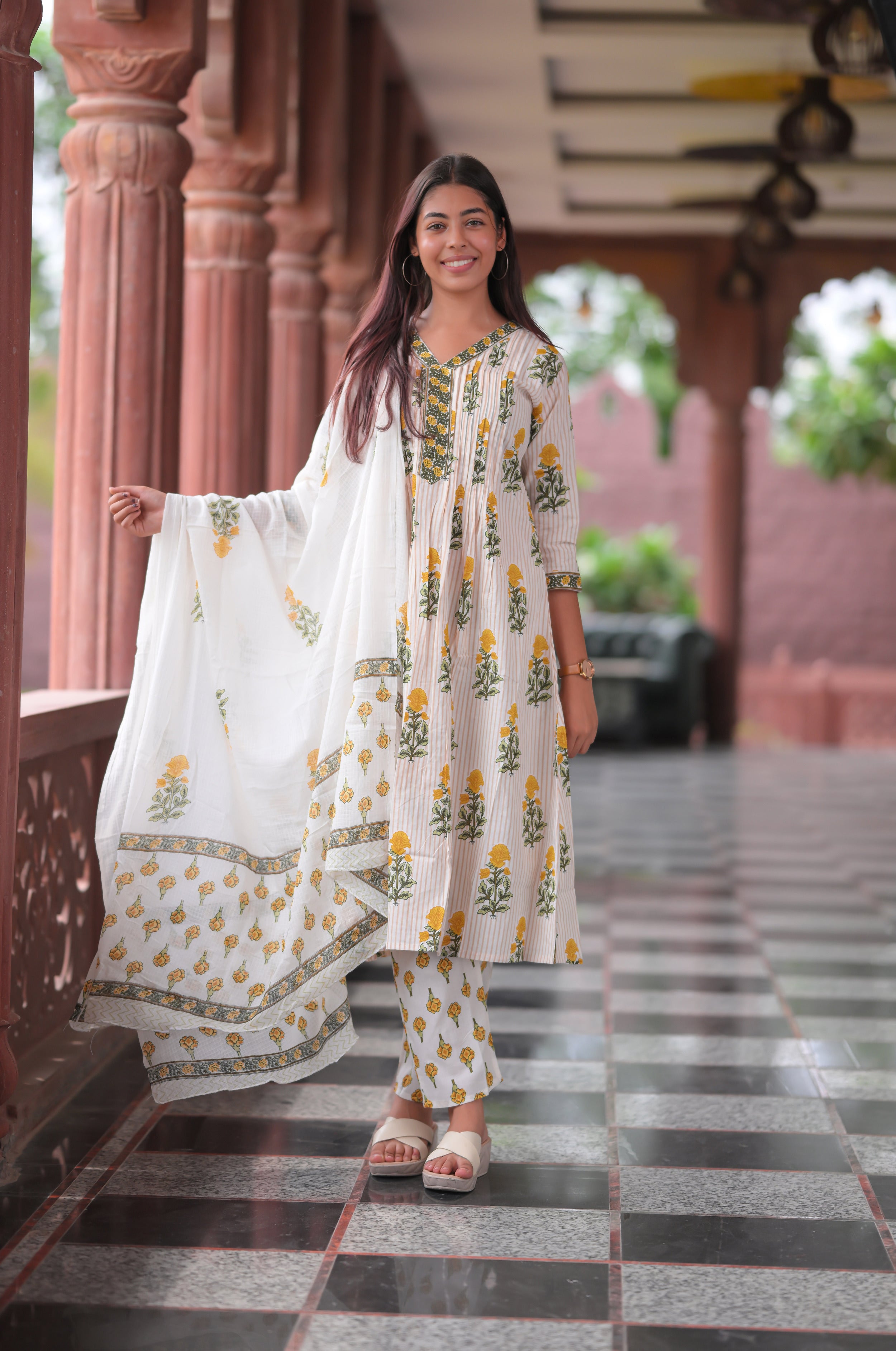 Crafted in soft 60x60 cotton, this 48-inch long kurti features subtle vertical stripes complemented by hand-block floral prints in vibrant mustard tones. The kurti's pintuck detailing and delicately printed neckline add to its visual appeal. Coordinated with a matching bottom and a lightweight, printed cotton voile dupatta, the set is perfect for day-to-evening ethnic elegance.