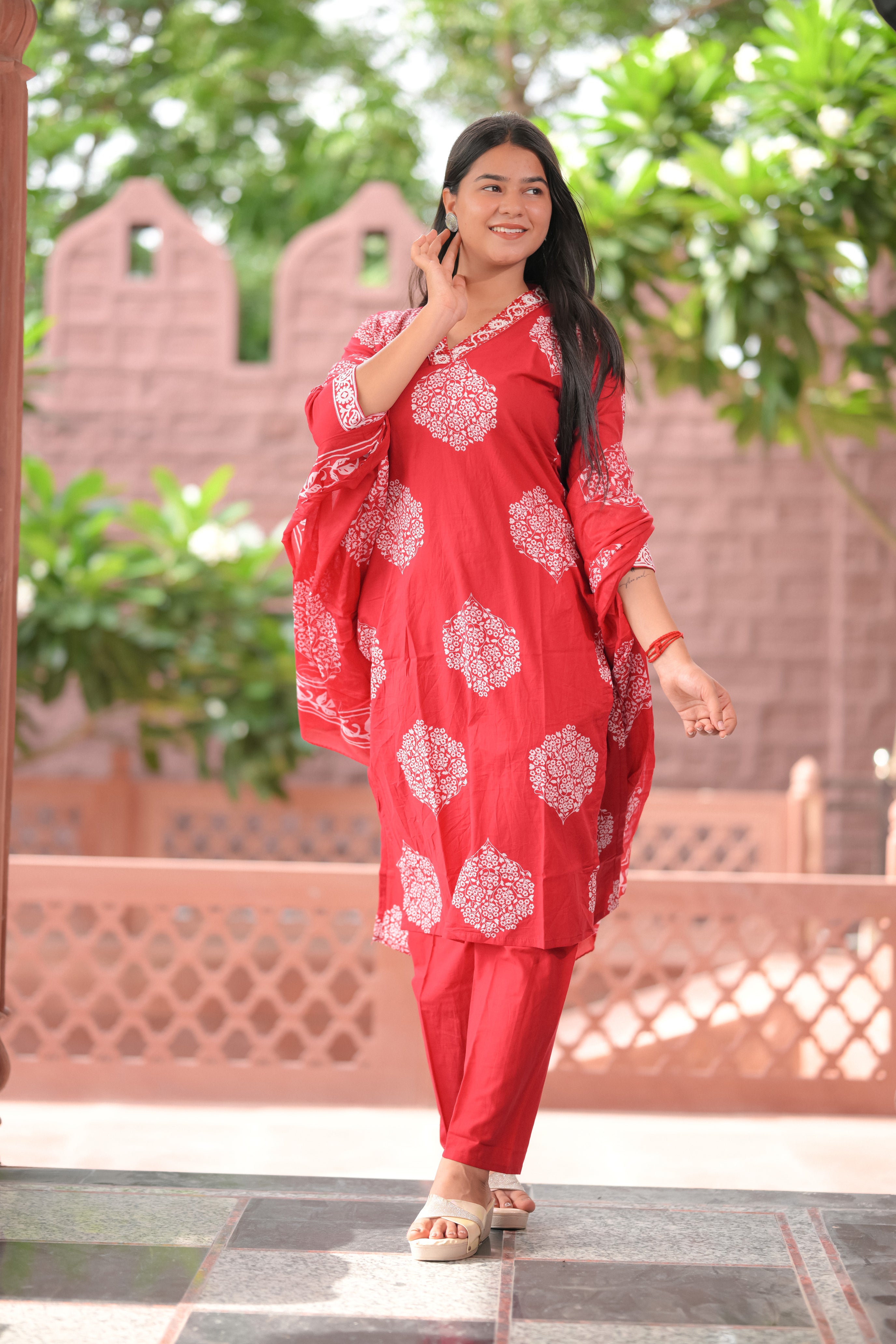 Radiate bold elegance with the Arihantam Ruby Bloom 3-Piece Set, a striking ethnic ensemble designed to turn heads with its vibrant red tone and intricate white discharge prints.